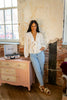 Soft, romantic, and made for sunlit afternoons. The Petals and Porcelain Blouse features a flattering V neckline with a delicate front tie, long sleeves with elastic cuffs, and intricate floral eyelet embroidery throughout. Finished with a gentle ruffle hem, this blouse feels light, airy, and effortlessly whimsical — the kind of piece you’d wear to a garden tea party or a slow stroll among the flowers.