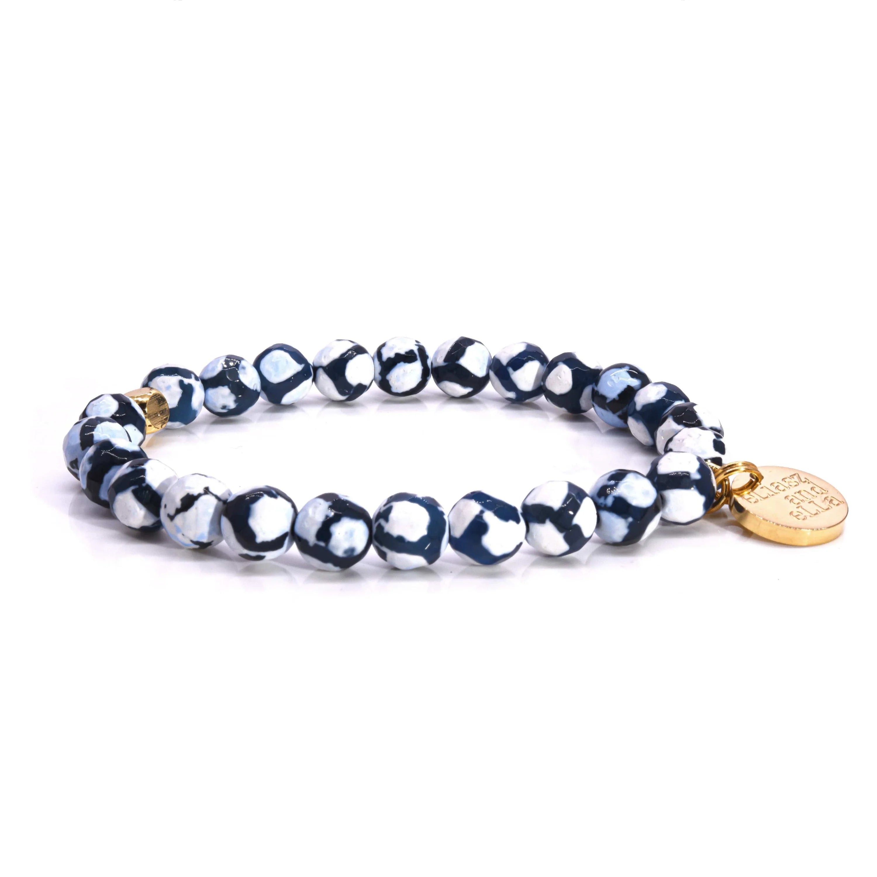 Beautiful, blue Tibetan agate stones with gold plated accents have this bracelet reminding us of the ocean. Tibetan agate is believed to have both physical and emotional cleansing properties. It is believed to enhance truthfulness and understanding.